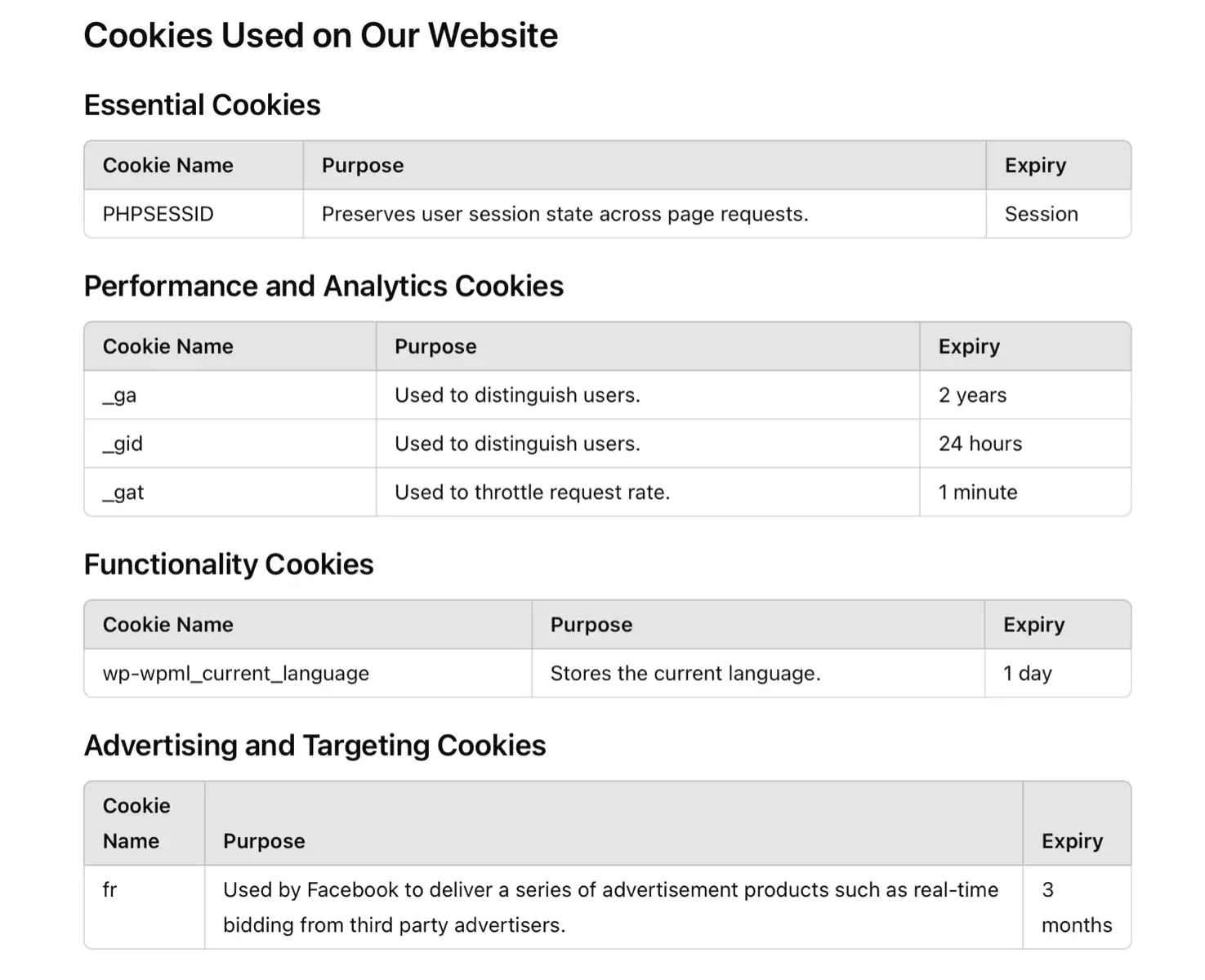 Performance and Analytics Cookies: These cookies collect information about how you use the Website, such as which pages you visit and if you experience any errors. These cookies help us improve the Website's performance and your user experience.